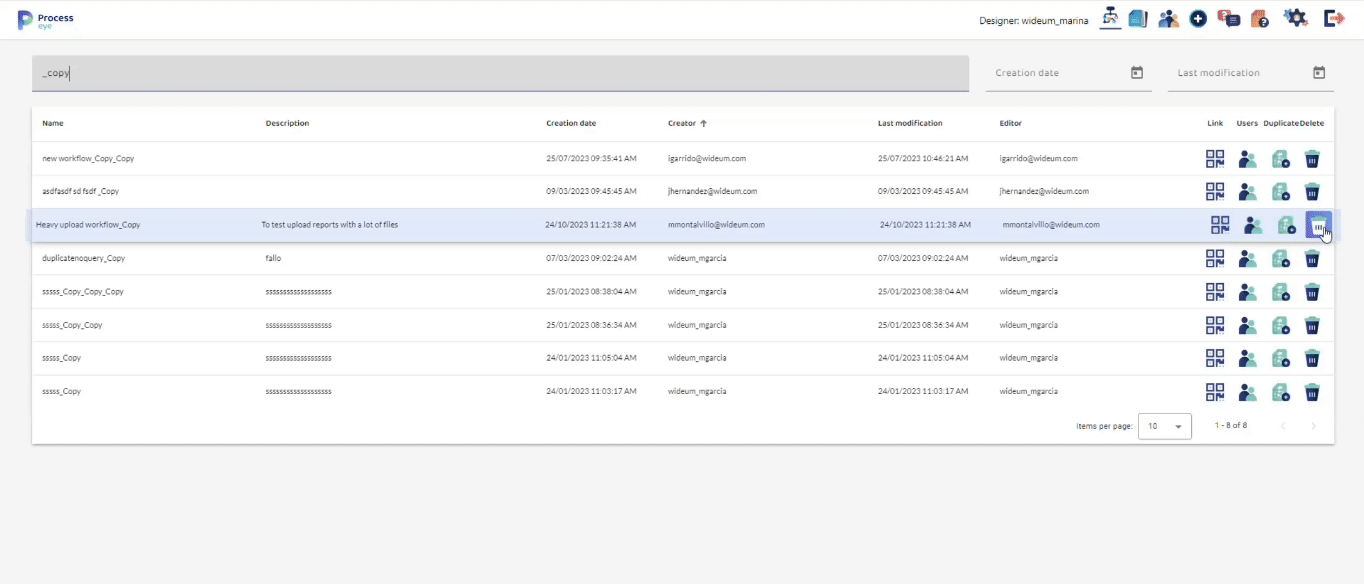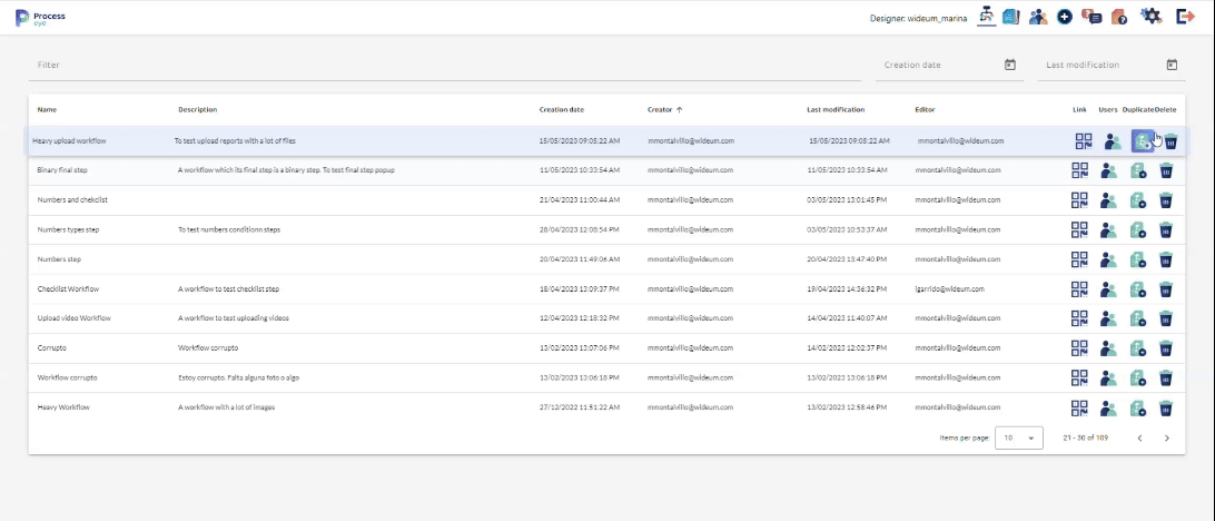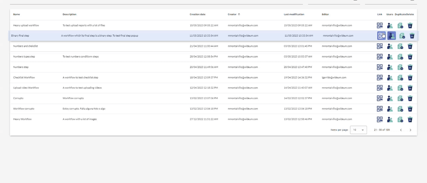 - Duplicate: A button that duplicates the selected workflow, appending “_Copy” to its name. This duplication does not include any permissions settings, so users must enter the workflow to customize it as needed. It’s a convenient feature for quickly creating a new workflow based on an existing one.